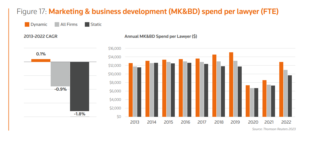 According to the latest (8th) iteration of Thomson Reuters Institute’s 2023 Dynamic Law Firms Report, Dynamic Law Firms consistently invest greater sums in their business development and marketing teams than Static Law Firms: