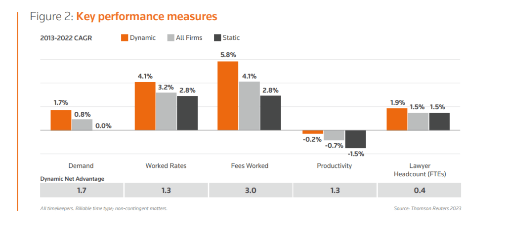 With Dynamic Law Firms consistently outpacing Static Firms in all growth Key Performance Measures; but, most notably from a business development perspective, in both ‘worked rates’ and ‘fees worked’.